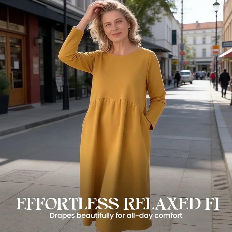 đVestido midi largo para mulher com decote redondo e bolsos â conforto sem esforço e elegância para o dia a diaâ¨